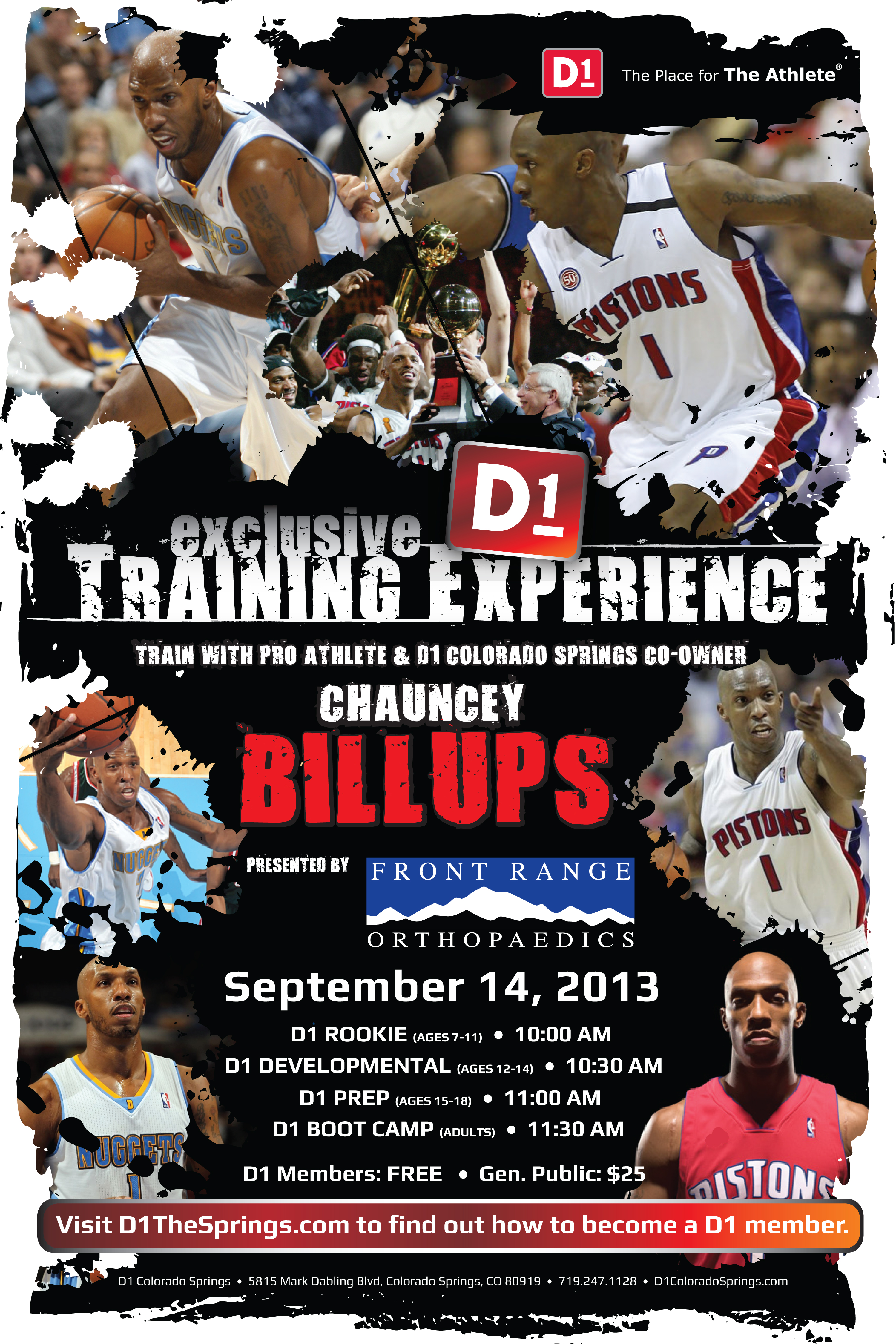 September 3, 2013 – On Saturday, September 14, Chauncey Billups will be hosting an exclusive D1 Colorado Springs event. During the Chauncey Billups D1 Colorado Springs Training Experience, D1 members and a limited number of participants from the general public will get the opportunity to be trained by Chauncey, with the assistance of D1 coaches. The event is free to D1 members and the general public price is $25. In addition to the training, participants will receive a commemorative poster and group photo with Chauncey.