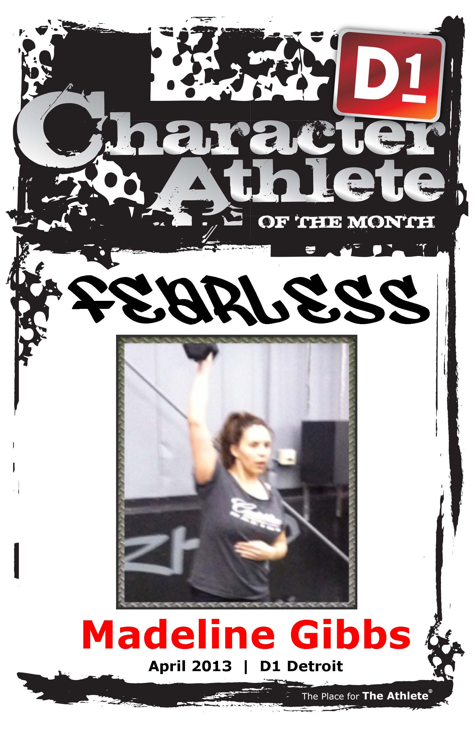 Madeline might be one of D1 Detroit’s most FEARLESS athletes! No matter what challenges are put in front of her in Boot Camp she rises to it. Whether it is more weight on a lift or getting through a circuit faster then the last time she did it Madeline works to her limit every time she steps in the door. Whenever we need someone to step up and be the first to start a set she has no hesitation. With these thoughts in mind D1 Detroit has awarded Madeline Gibbs with the athlete of the month award for being FEARLESS!